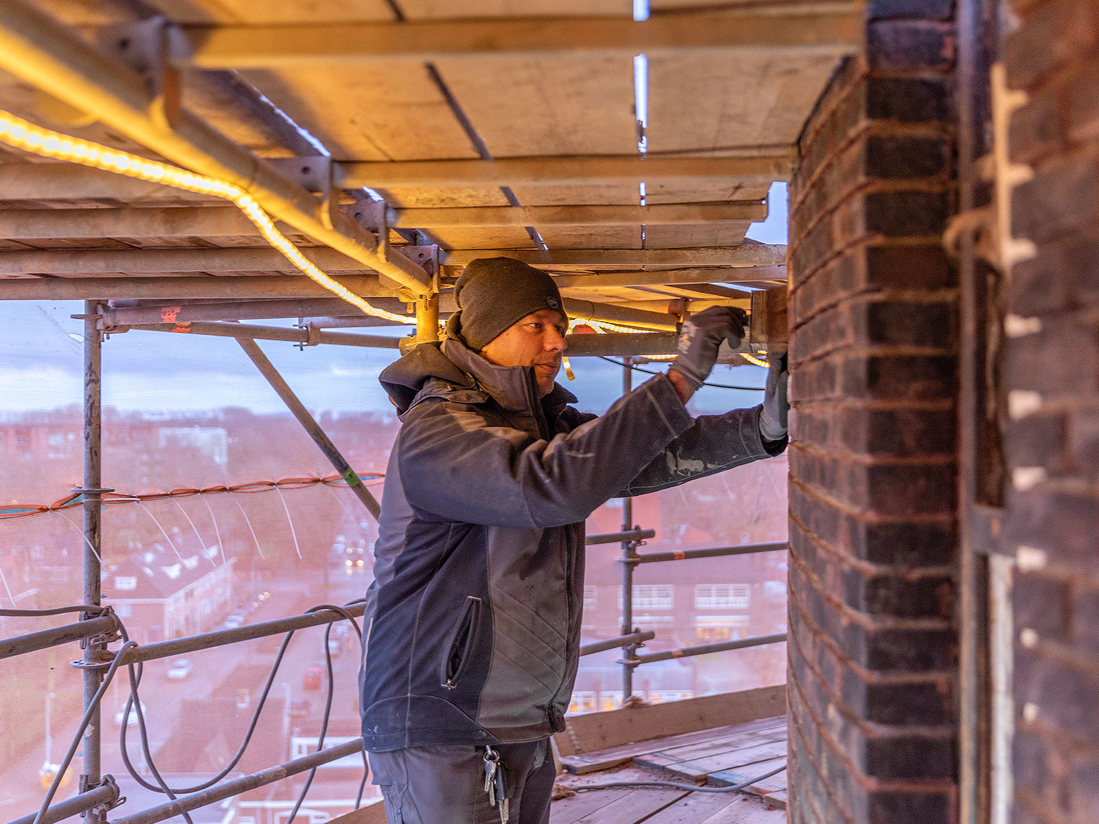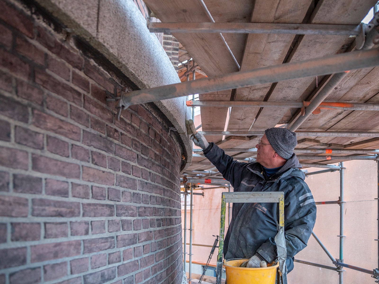 Wij restaureren het complete metsel- en voegwerk. Het meest complex is de restauratie van al het betonwerk, ook wel ‘kunststeen’ genoemd. Op het eerste oog zou je zeggen dat alle steenachtige elementen van graniet zijn. Maar niets is minder waar, alle steenachtige elementen zijn gemaakt van granito beton. Door roestende wapening, wat te dicht aan het oppervlak zit, komen er complete schollen beton los. Aan ons de taak dit volgens de richtlijnen te herstellen. Duurzaam maar ook esthetisch verantwoord. Dit betekent het nabootsen van ‘uitgesleten’ granito beton, een zeer uitdagende klus. De eerste proeven zijn gereed en worden deze week beoordeeld door de Monumentenzorg, Gemeente Utrecht en de Rijksdienst.