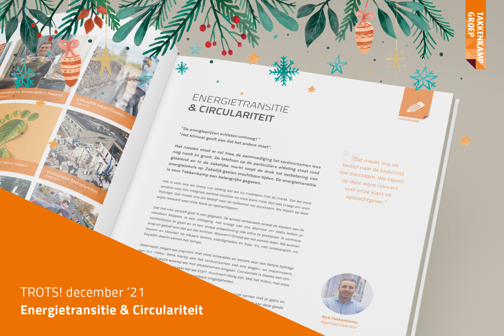 In deze editie leest u onder andere over de Rabobank Innovation Challenge die we als Takkenkamp gewonnen hebben, onze nieuwe ondernemersraad en de Airofill® fabriek. Van Milt Restaurateurs pakt grote projecten aan met het certificaat Restaureren Historisch Beton op zak en als Groep zijn we bezig met verschillende pilots in het kader van circulariteit. De vraag: “Wat doe jij om bij te dragen aan een beter milieu?” werd veelvuldig door onze medewerkers beantwoord. Verder leest u over gave projecten, de financiële ontwikkelingen en hoe Koedooder het metselwerk aanpakt.